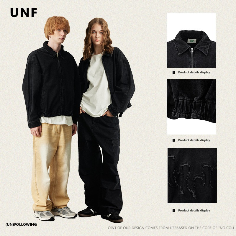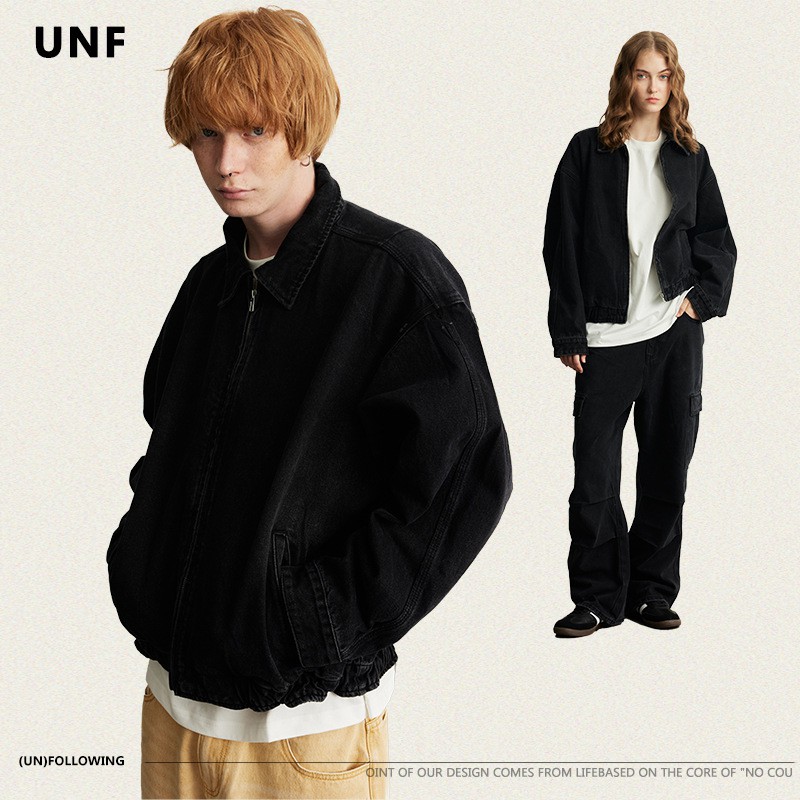 UNF Cleanfit Harrington denim jacket Boxy short width distressed wash black denim jacket men's autumn and winter